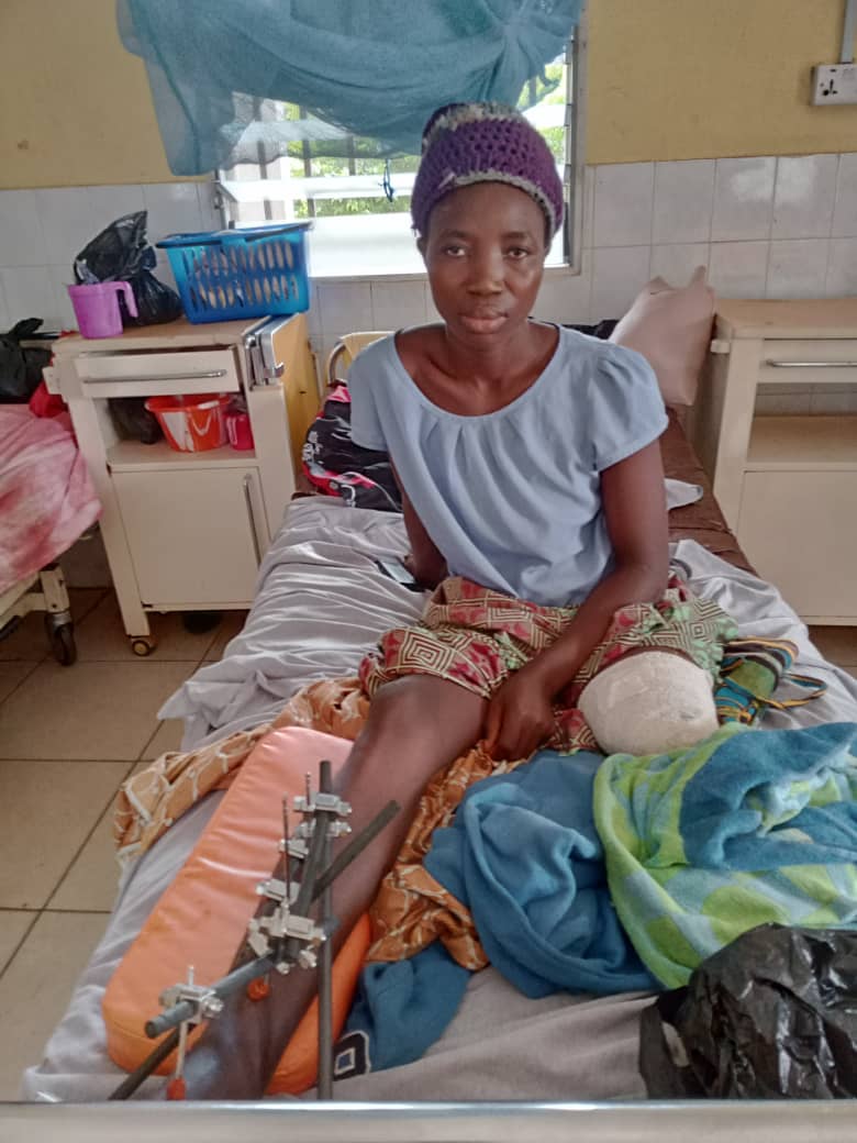 This is Sia Mattia, a 25-year old woman from a village in Kono District. One unfortunate day, Mattia was carrying food to the farm when a tree suddenly fell on the road where she was walking, right on top of her. Her left leg was completely cut off, the right lower leg severely broken. At Koidu Government Hospital they amputated her left leg, before referring her to Lion Heart Medical Centre for X-ray and further treatment.